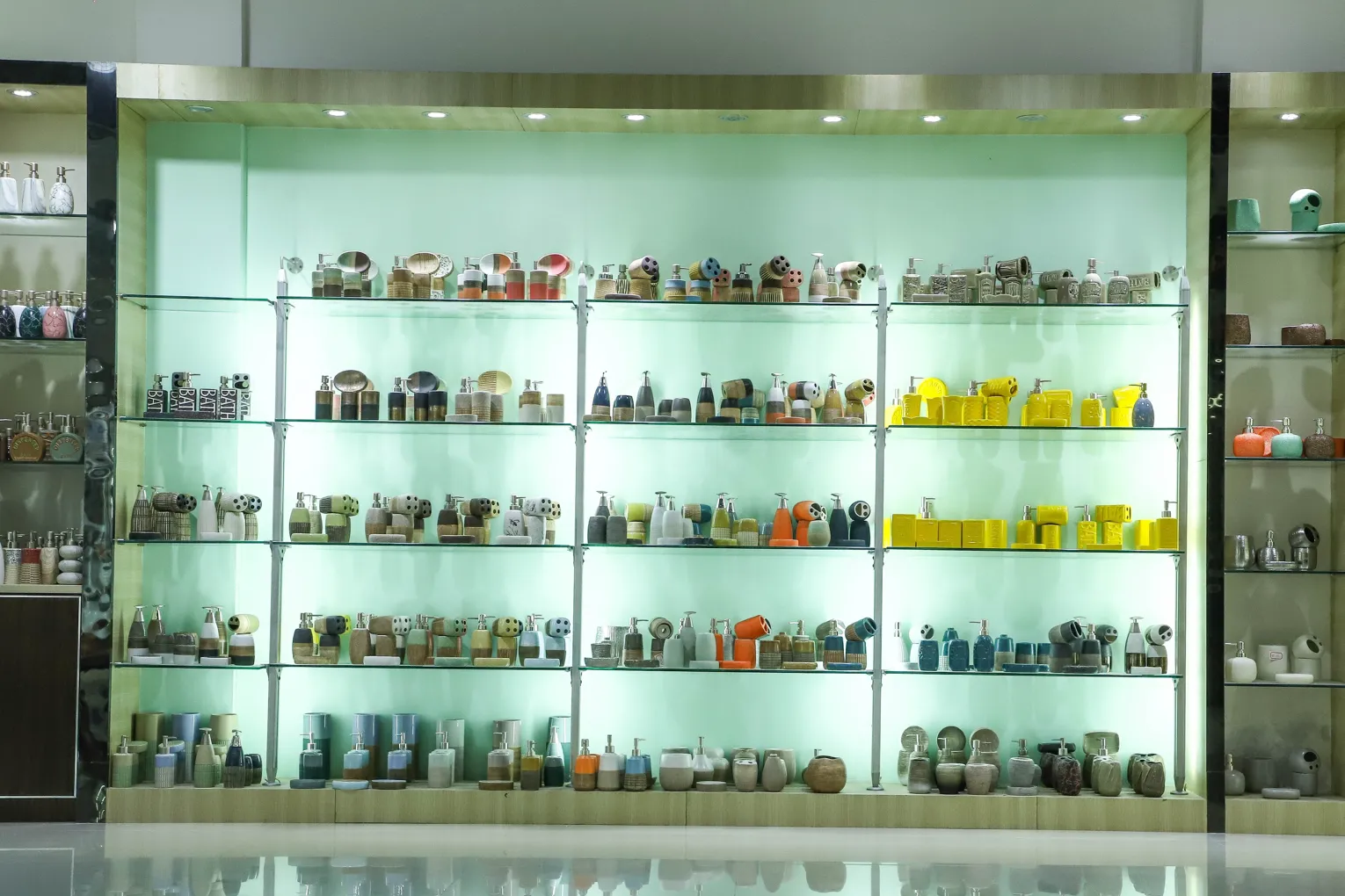 Our skilled artisans create unique designs including white porcelain with decals, colored glaze series, and brushed-finish collections, highlighting the beauty and texture of handcrafted ceramics for elegant bathroom accessories.