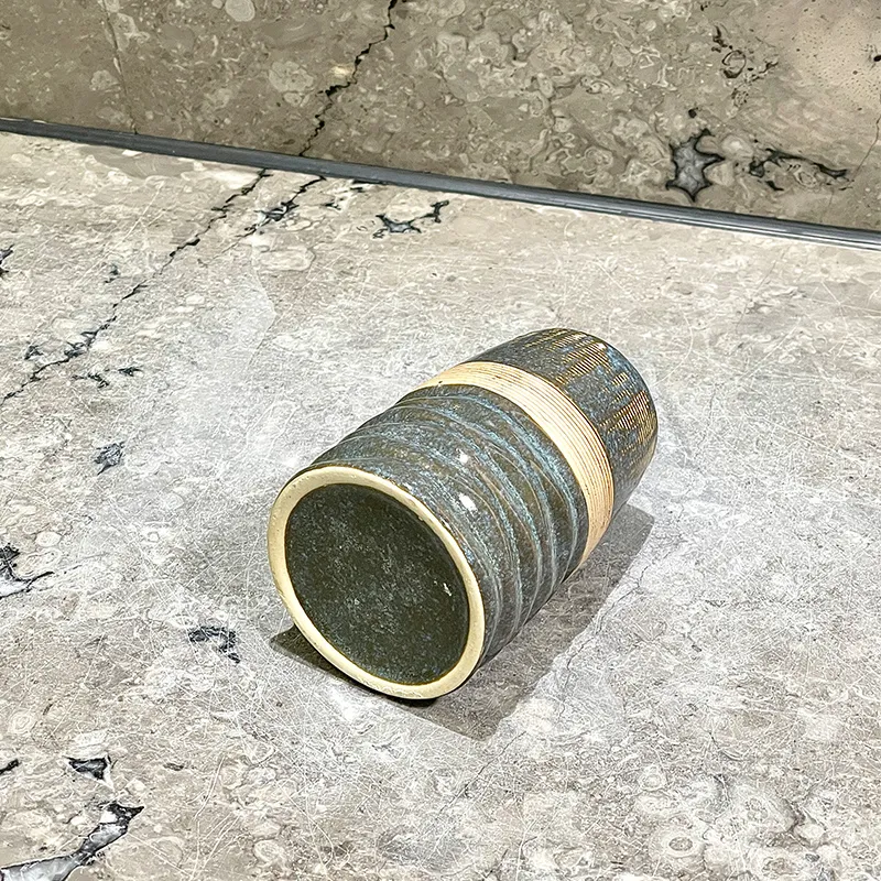 Custom handmade ceramic bathroom tumbler with factory wholesale pricing and free samples. Rustic green finish with gold accent, artisan style cup perfect for bathroom sets, hotel projects, retail, and bulk customization.