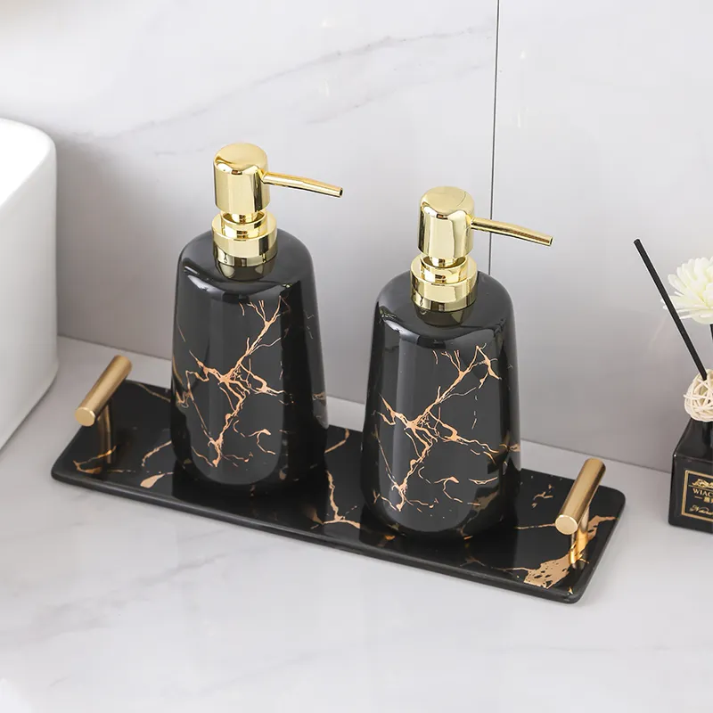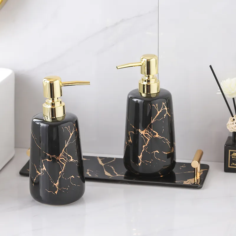 3-piece gold decal bathroom set wholesale featuring marble vein ceramic soap dispenser and tray, perfect for stylish bathroom décor. Factory direct supply with competitive wholesale pricing and free samples for distributors and brand buyers.