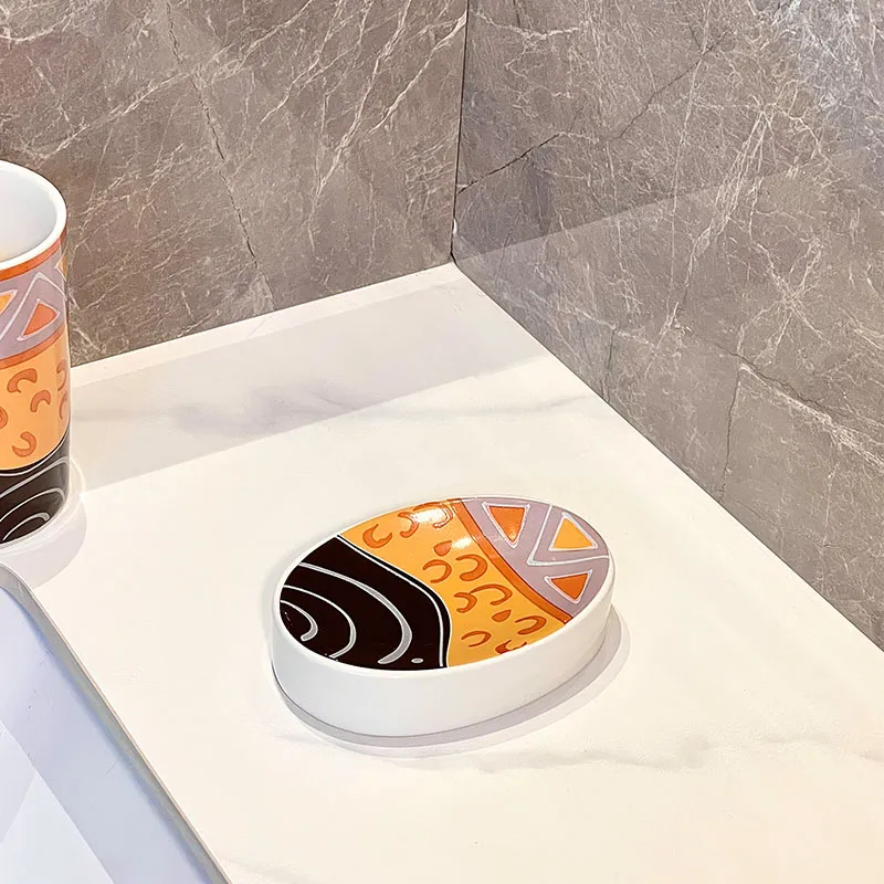 Ceramic decal bathroom set wholesale featuring a 4-piece African pattern ceramic bath accessories set. Factory direct supply offers stable wholesale prices, OEM customization options, and free samples for bulk orders.
