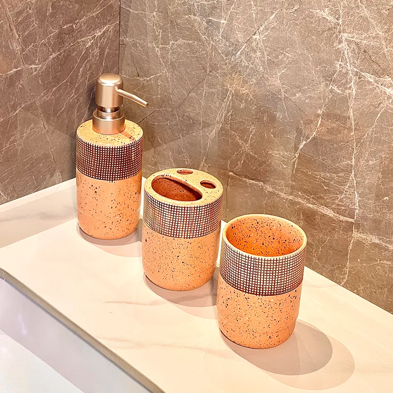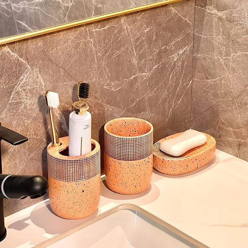 - Blush Pink Speckled Grid Design: The Wholesale Ceramic Toothbrush Holder features a delicate pink speckled grid pattern, adding warmth and depth to any bathroom.