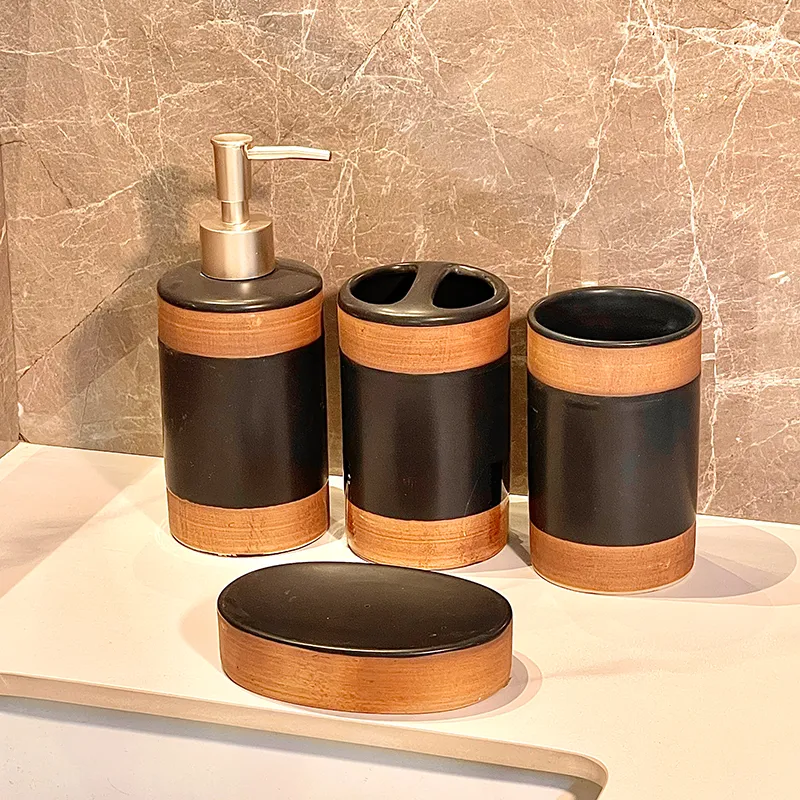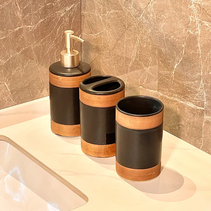 Modern black and wood-grain double-slot ceramic toothbrush holder with a stable, weighted base and smooth glazed surface. Hygienic, easy to maintain, and perfect for hotels, homes, and retail. Factory-direct supply delivers competitive pricing plus free samples for quality evaluation.