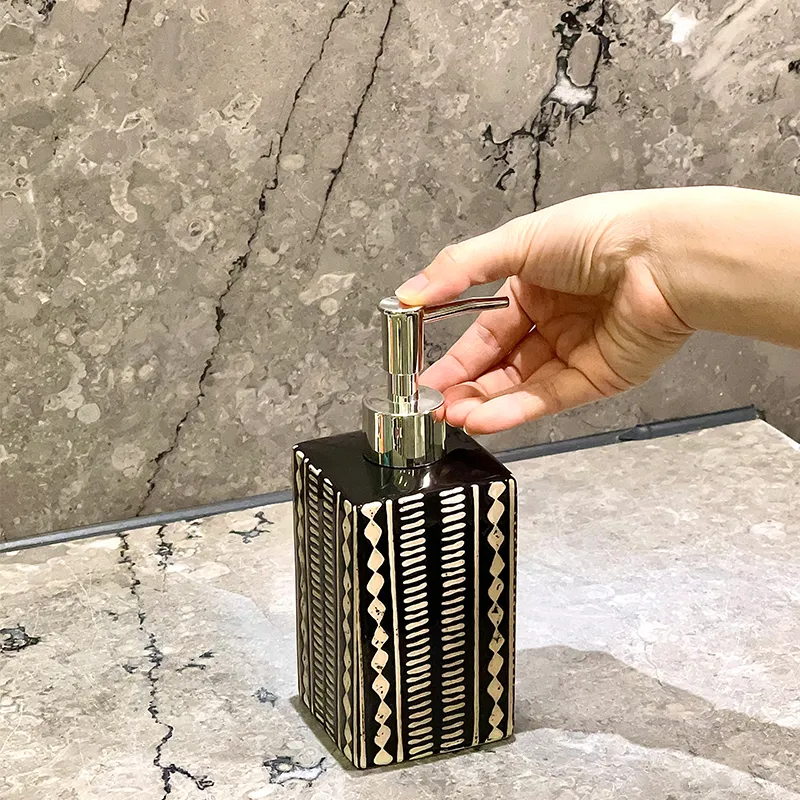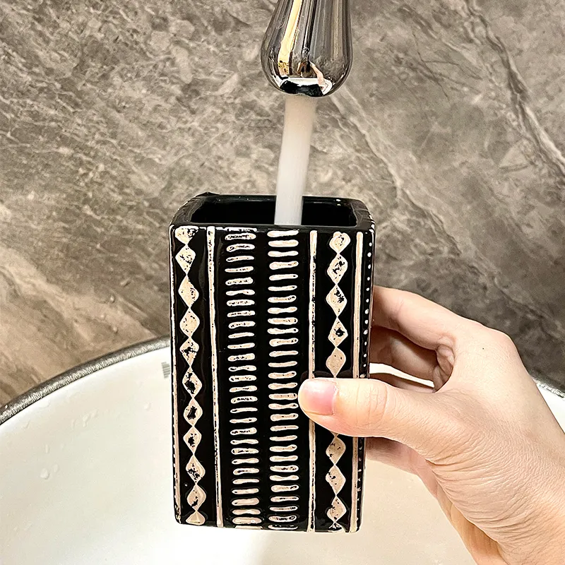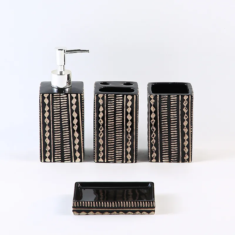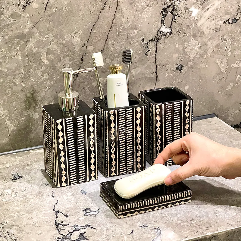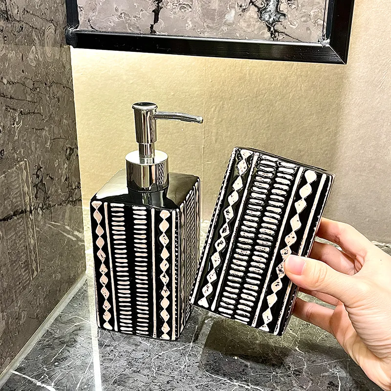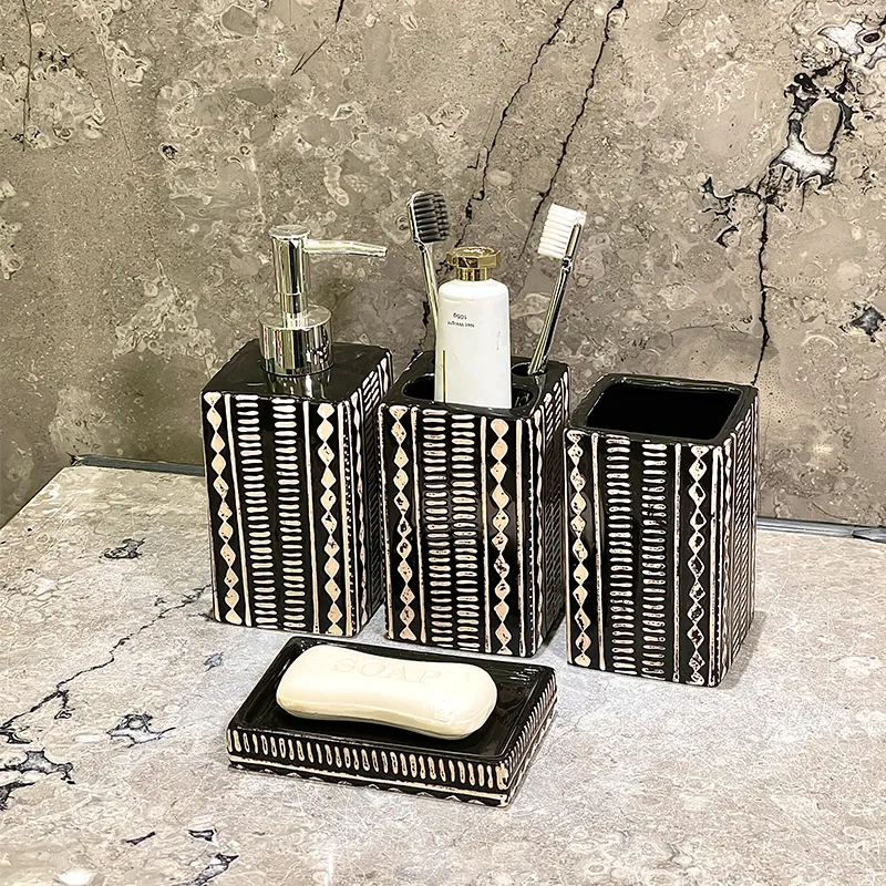 Custom Decor Bathroom Set Wholesale – Stylish Black & White Patterned Ceramic Bath Kit