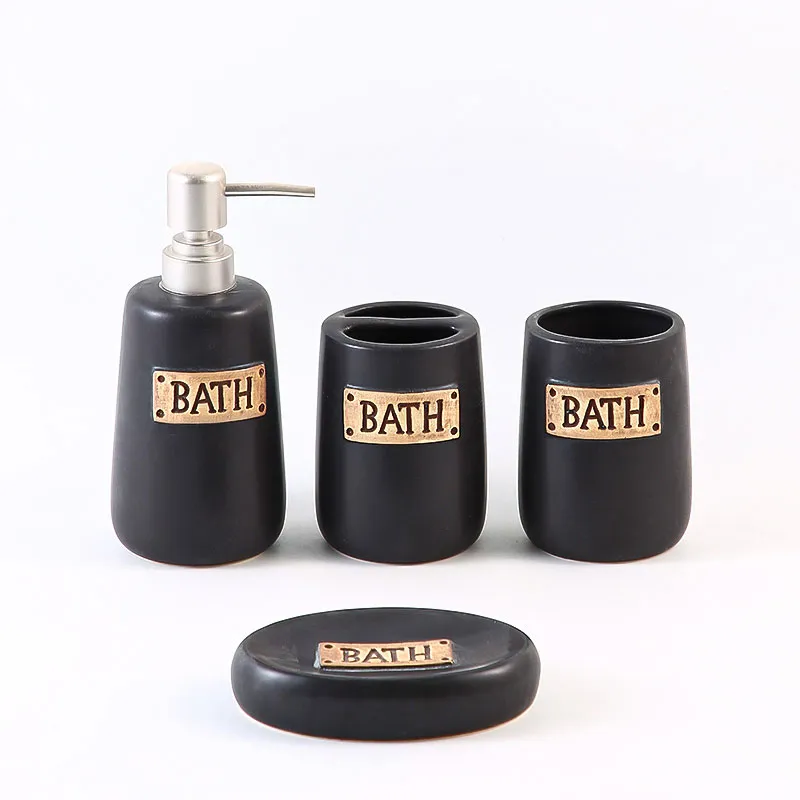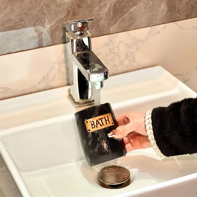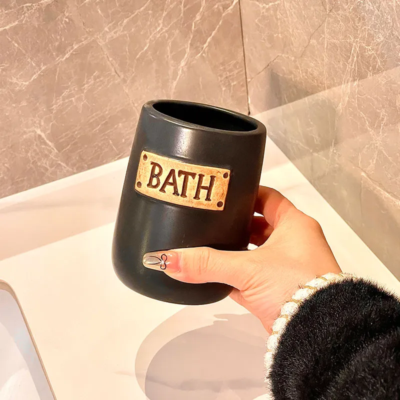 Customized Ceramic Tumbler with glossy black finish and vintage BATH embossing, perfect for bathroom countertop organization and daily use for toothbrushes and mouthwash. Factory direct supply, wholesale price advantage, free samples available for bulk buyers and OEM customization.