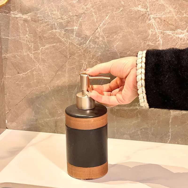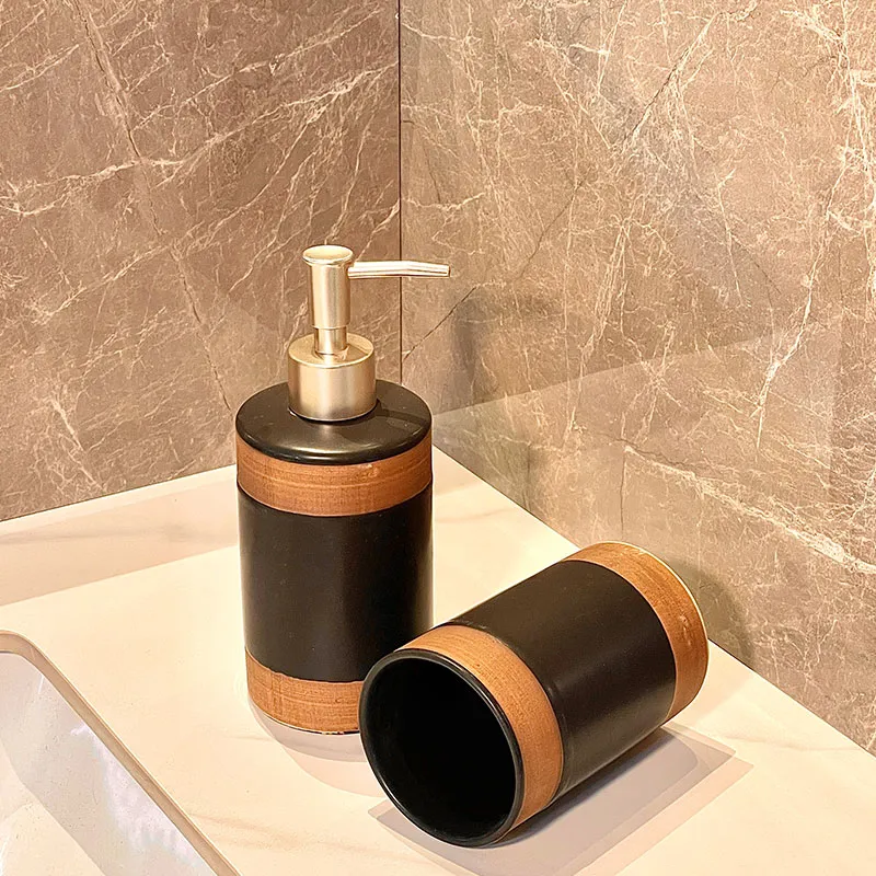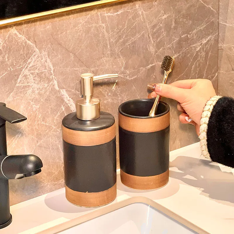 Welcome to our custom 4-piece designer bathroom sets wholesale feature black and bronze ceramic design with lotion dispenser, toothbrush holder and soap dish, ideal for modern bathrooms. Factory direct wholesale pricing and free samples for bulk buyers.