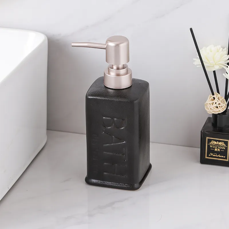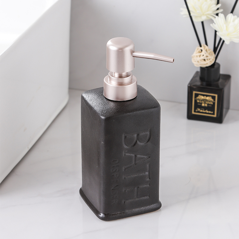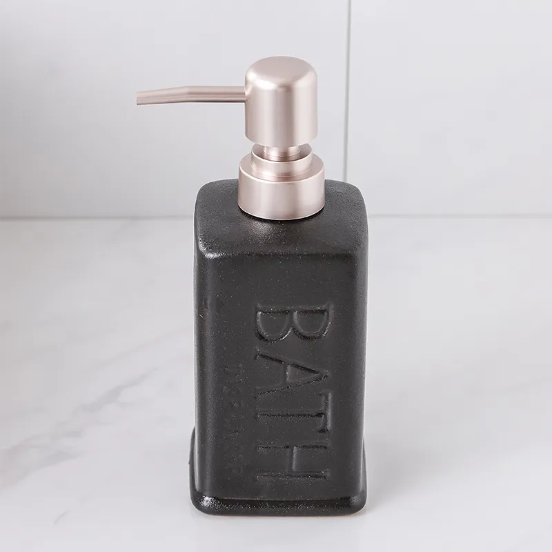 Matte soap dispenser wholesale black embossed BATH ceramic pump dispenser with modern matte finish. Ideal for bathroom or kitchen use. Factory direct supply with competitive wholesale pricing and free samples for bulk buyers.