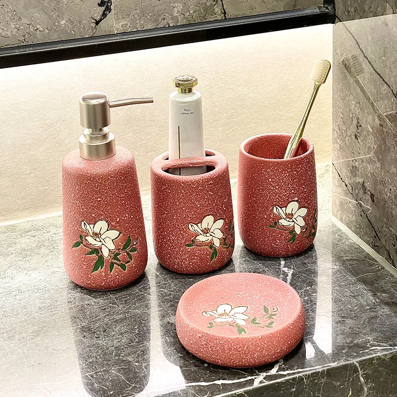 Pink Bathroom Set Wholesale 4-Piece Floral Printed Ceramic Bathroom Accessories for Hotel