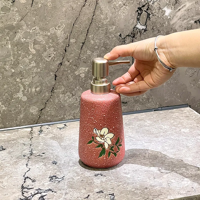 Pink bathroom set wholesale floral printed ceramic bathroom accessories kit includes soap dispenser, tumbler, soap dish, and tray. Ideal for hotel and home bath organizers. Factory direct supply with competitive wholesale pricing and free samples available.