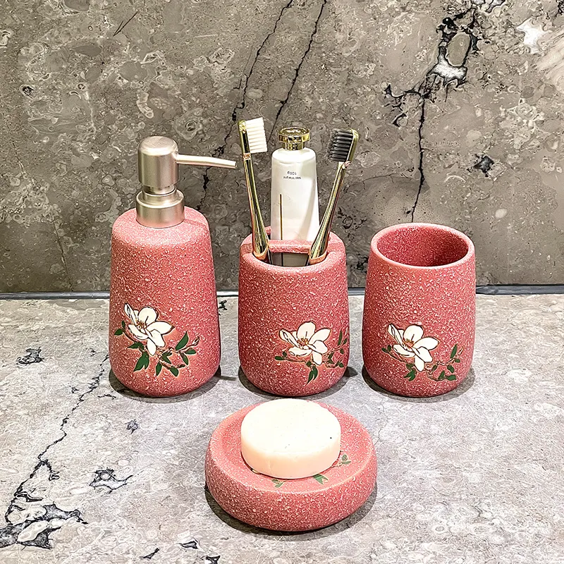 - Pink Bathroom Set Wholesale Ceramic Four-Piece Set: Includes hand soap dispenser, toothbrush cup, soap dish, and tray—complete set for convenient bulk purchasing.