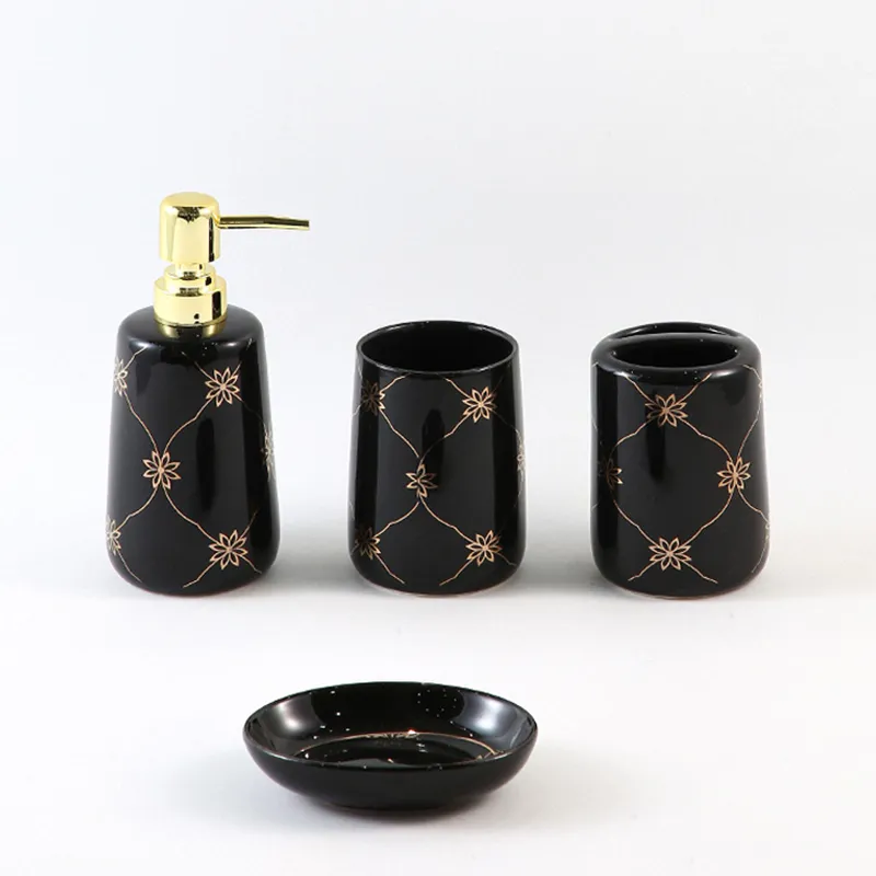 Wholesale Luxury Bathroom Set 4 Piece Black and Gold Glossy Ceramic Bathroom Accessories in Bulk
