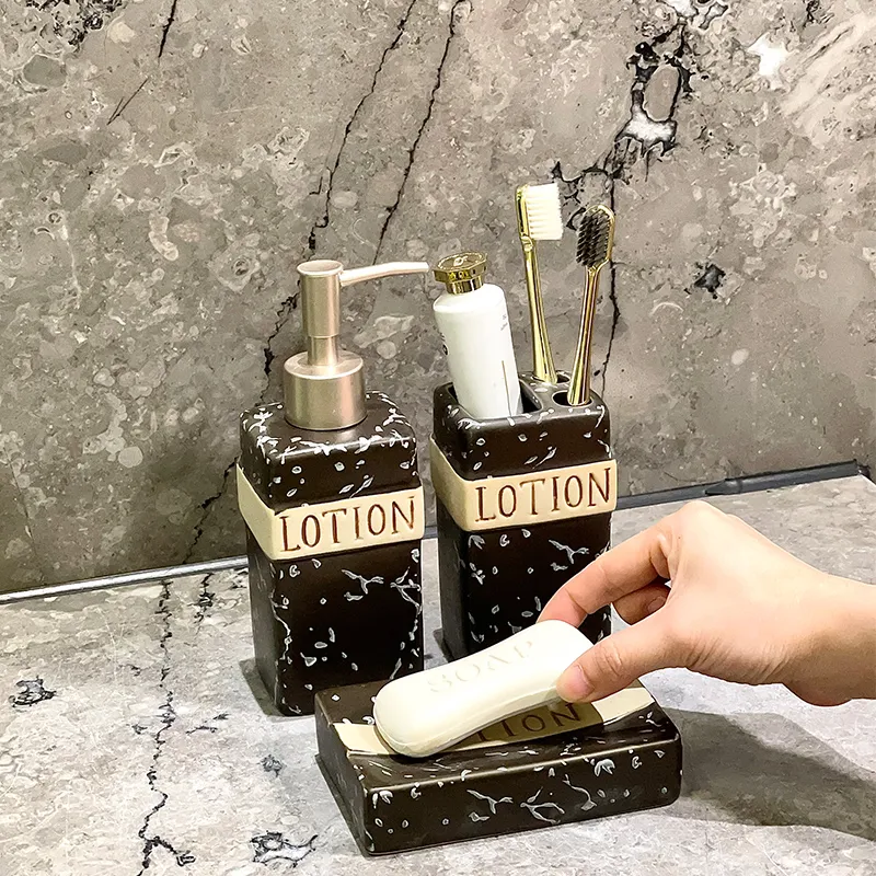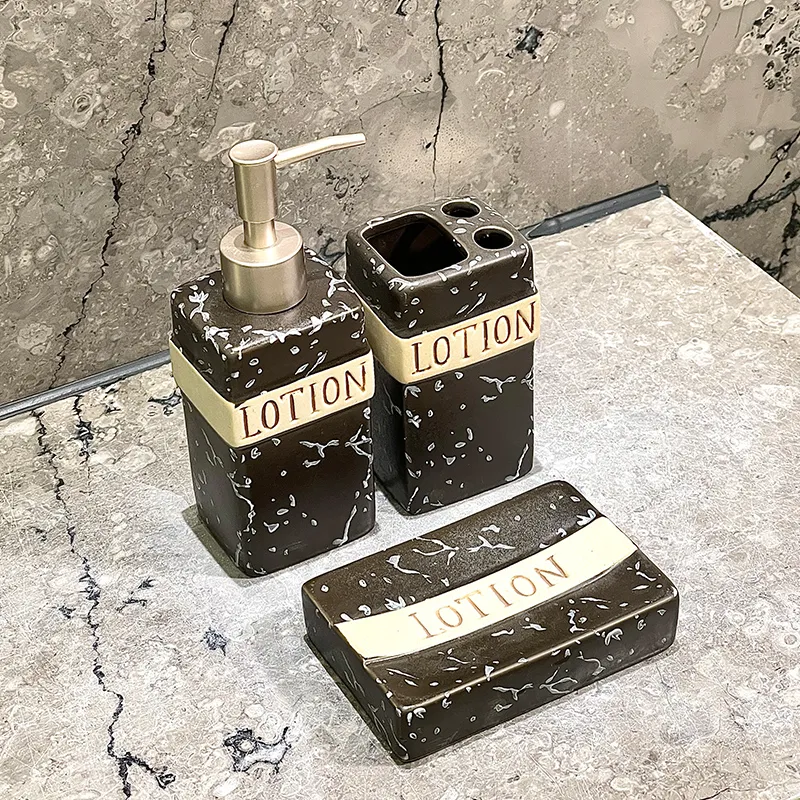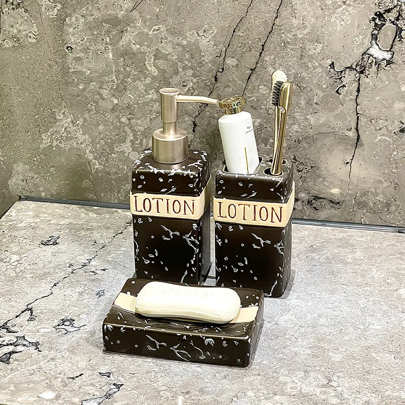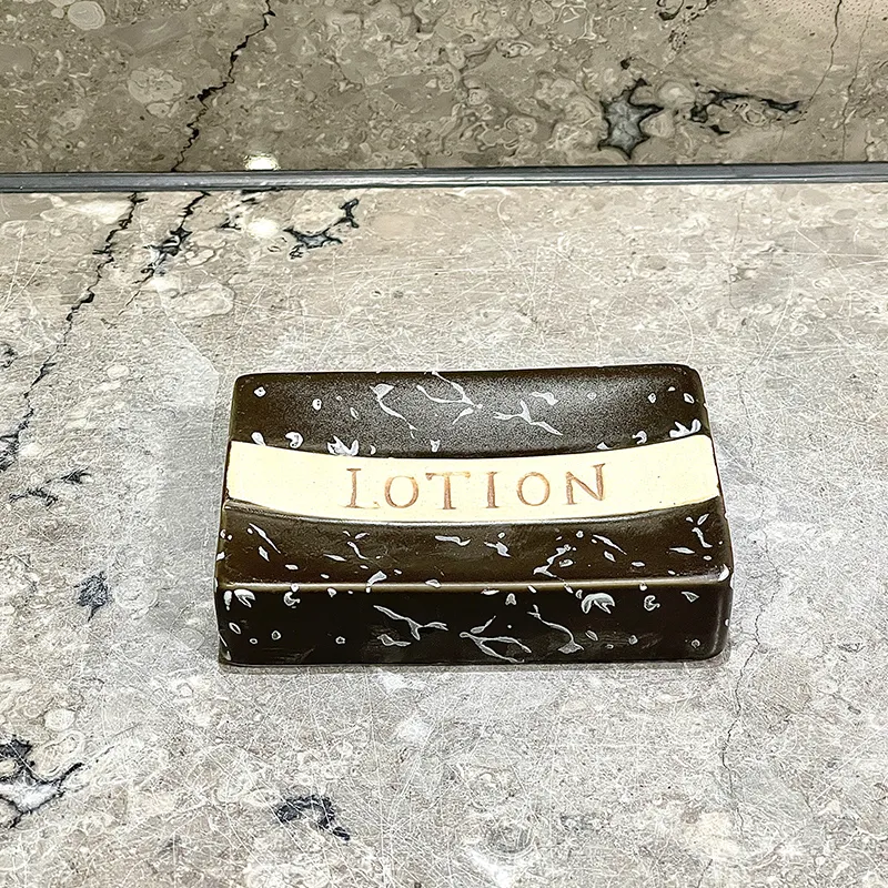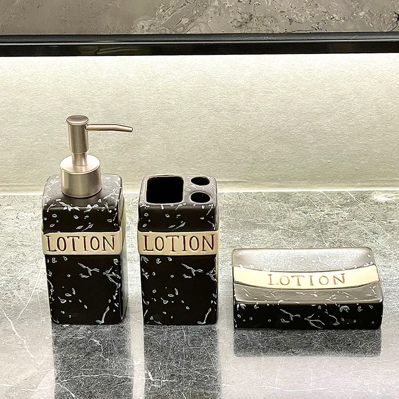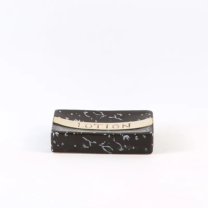 Cerâmica preta para saboneteiras por atacado com preços por atacado de fábrica e amostras grátis. Suporte de cerâmica “LOTION” de efeito mármore preto e dourado com acabamento de luxo, perfeito para conjuntos de casa de banho, projectos de hotel, retalho e personalização a granel.